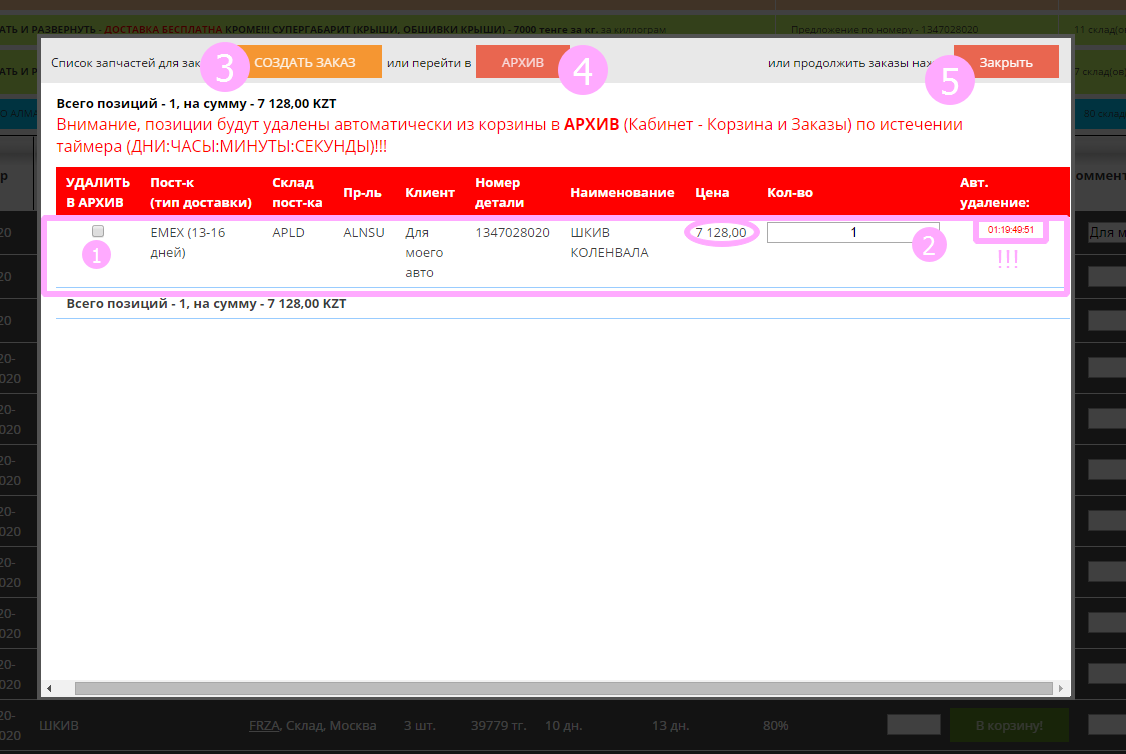 После нажатия кнопки В корзину! откроется всплывающее окно с данными Вашей корзины. (1)Для удаления запчасти из корзины кликните левой кнопкой мыши на чекбоксе. Удаление произойдет автоматически (2)Для изменения количества запчастей в корзине введите новое количество в соответствующее поле (3)Чтобы создать заказ - нажмите кнопку СОЗДАТЬ ЗАКАЗ (4)Чтобы перейти в Архив корзины - нажмите кнопку Архив (Архив корзины - это хранилище удаленных или устаревших позиций) (5)Чтобы закрыть данное окно и продолжить выбор (поиск) запчасти - нажмите кнопку Закрыть ВНИМАНИЕ!!! Запчасть будет автоматически удалена из корзины в АРХИВ по истечении таймера хранения запчасти. Это необходимо для того, чтобы обезопасить Вас от курсовых колебаний и не актуального предложения поставщиков. В случае, если запчасть удалена в АРХИВ - чтобы заново перезаказть ее - перейдите в АРХИВ корзины и кликните по ее номеру и заново добавьте ее в корзину
